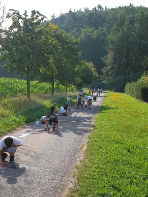 Mittwochs ging es kreativ weiter. Mit Straßenkreide wurden entlang des Radweges am Mundwald verschiedenste Motive „zu Asphalt“ gebracht und für tolle Bilder genutzt. Bei der großen Hitze sorgte eine kleine Wasserschlacht zwischendurch für erfrischende Abkühlung.