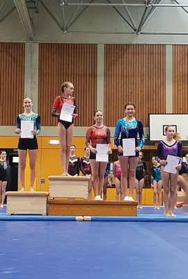 Leni (Jahrgang 2009) hatte sich in der Kürklasse LK2 der Altersklasse 16-29 qualifiziert und musste samstags an die Geräte. In einem Starterfeld von 20 Turnerinnen kam sie auf einen guten 8. Platz. Während ihr am Boden im Vergleich zu den vorderen Plätzen noch etwas die schwierigeren Elemente fehlten, konnte sie am Stufenbarren mit der Höchstwertung glänzen.