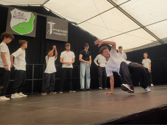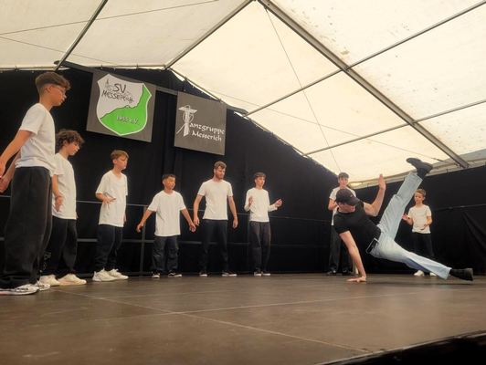 Trotz hochsommerlicher 34 Grad zeigte die Breakinggruppe des WTV beim Tanzfest in Messerich eine starke Performance. Die zehn Tänzer im Alter von 8 bis 21 Jahren überzeugten das Publikum mit akrobatischen Moves, Teamspirit und cooler Bühnenpräsenz.